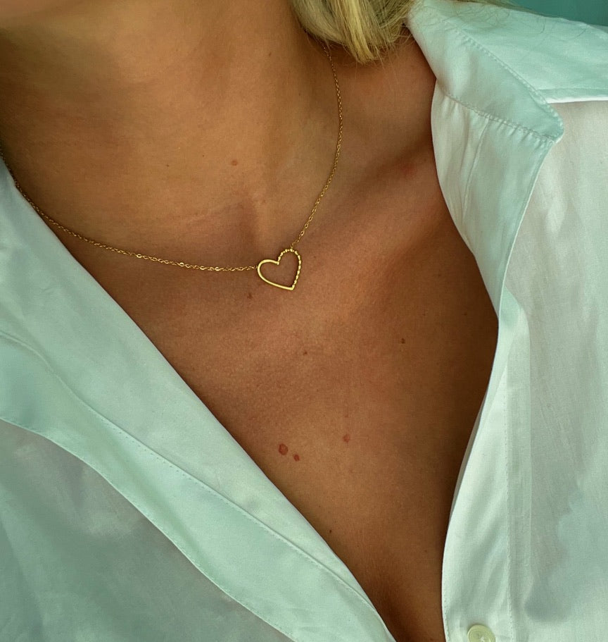 A fine necklace with small heart on. One side plain while the other side of the heart is finished with small balls. Very pretty to wear alone, or just with other necklaces as a set.