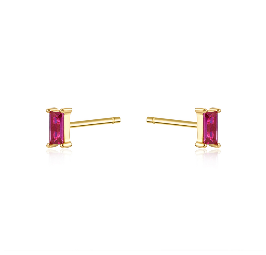 A small earstud shaped like a rectangle or baguette shape. This one has a pink stone.