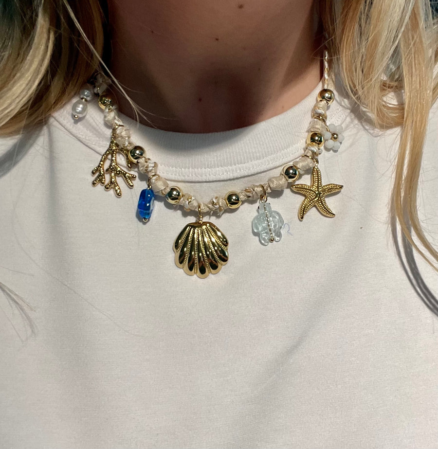 A chunky beige cord necklace with different charms on it. The necklace has a shell, lucky charm, ... on it.
