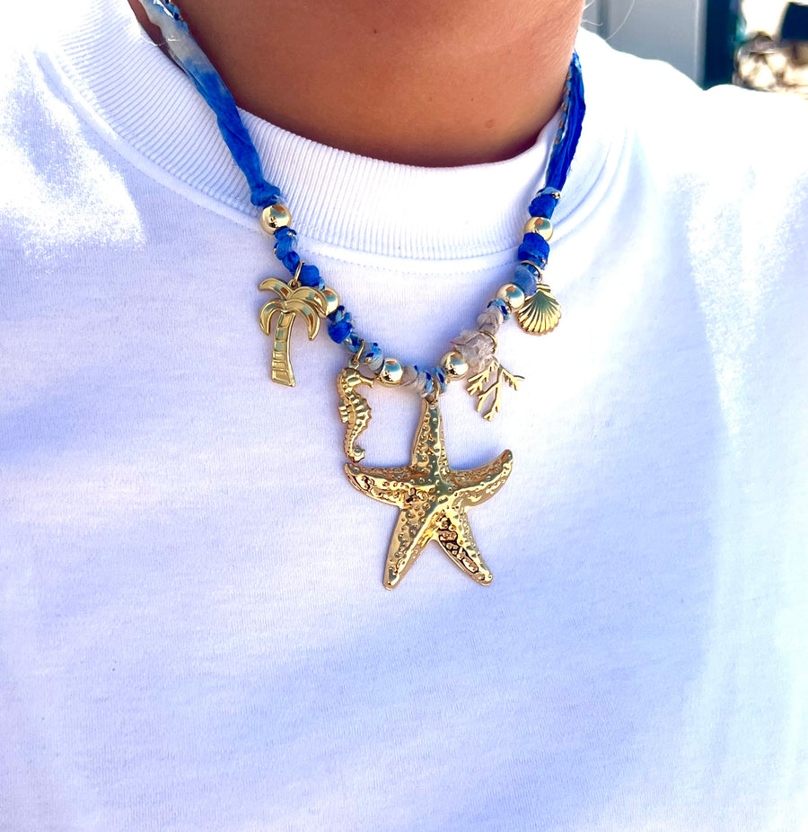 A blue cord necklace with different golden details on it, such as a starfish, shell, ...