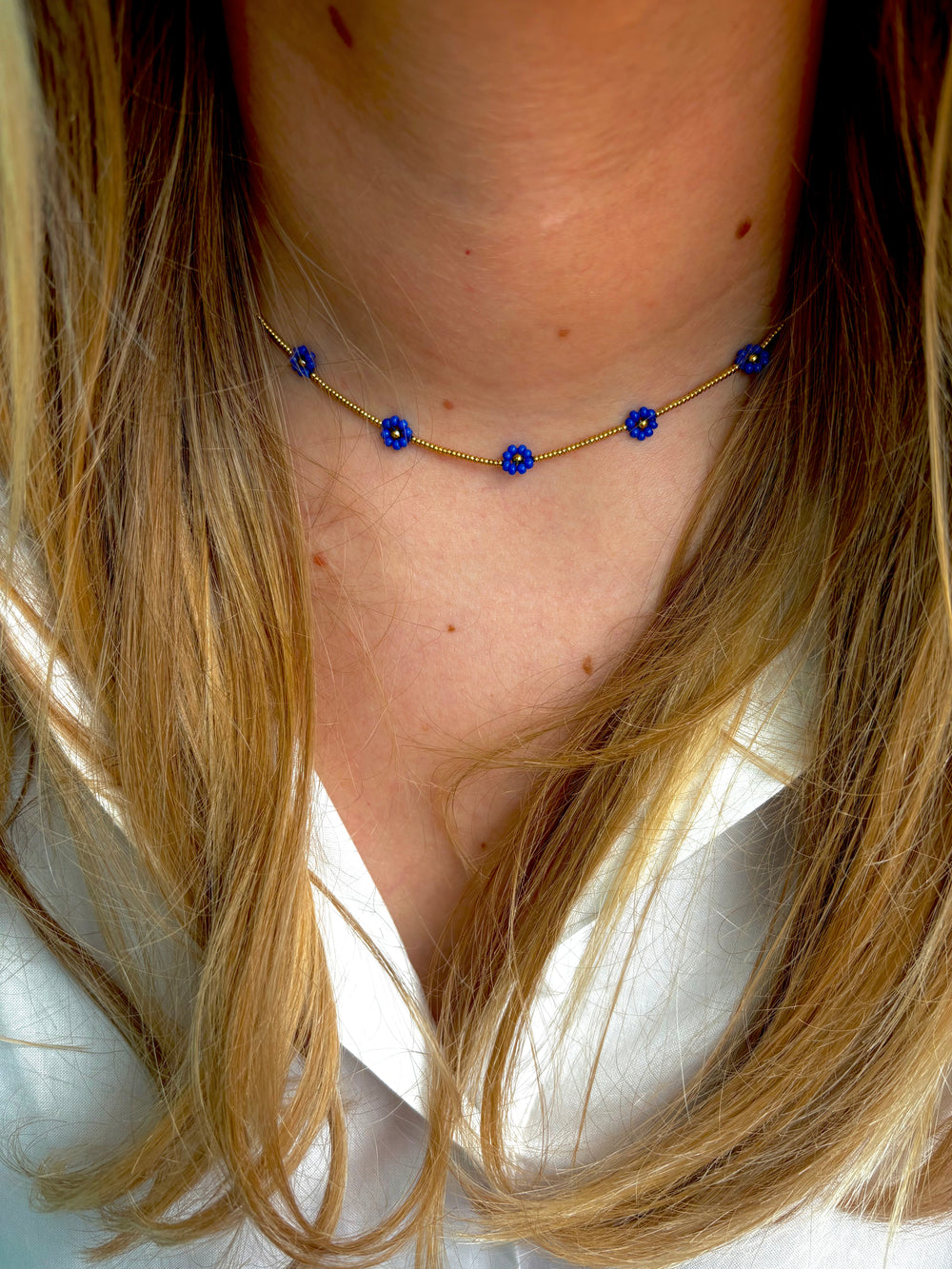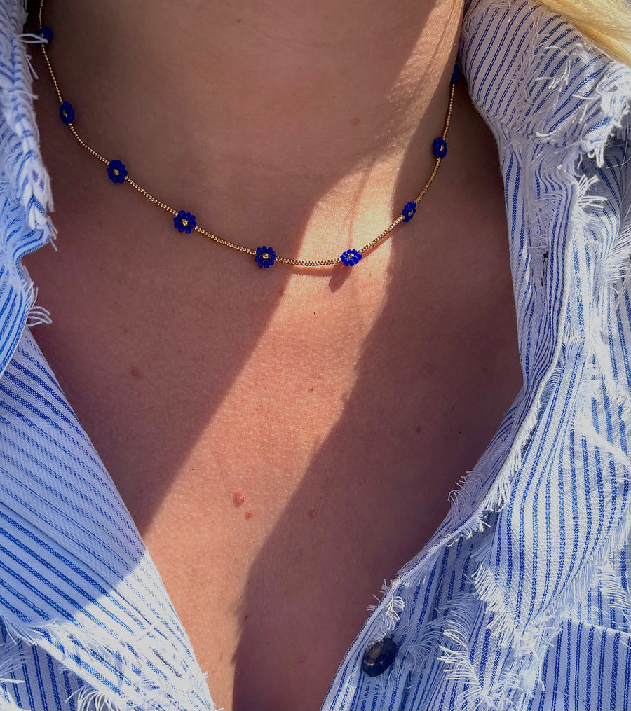 A gold beaded necklace with alternating blue flowers in it.