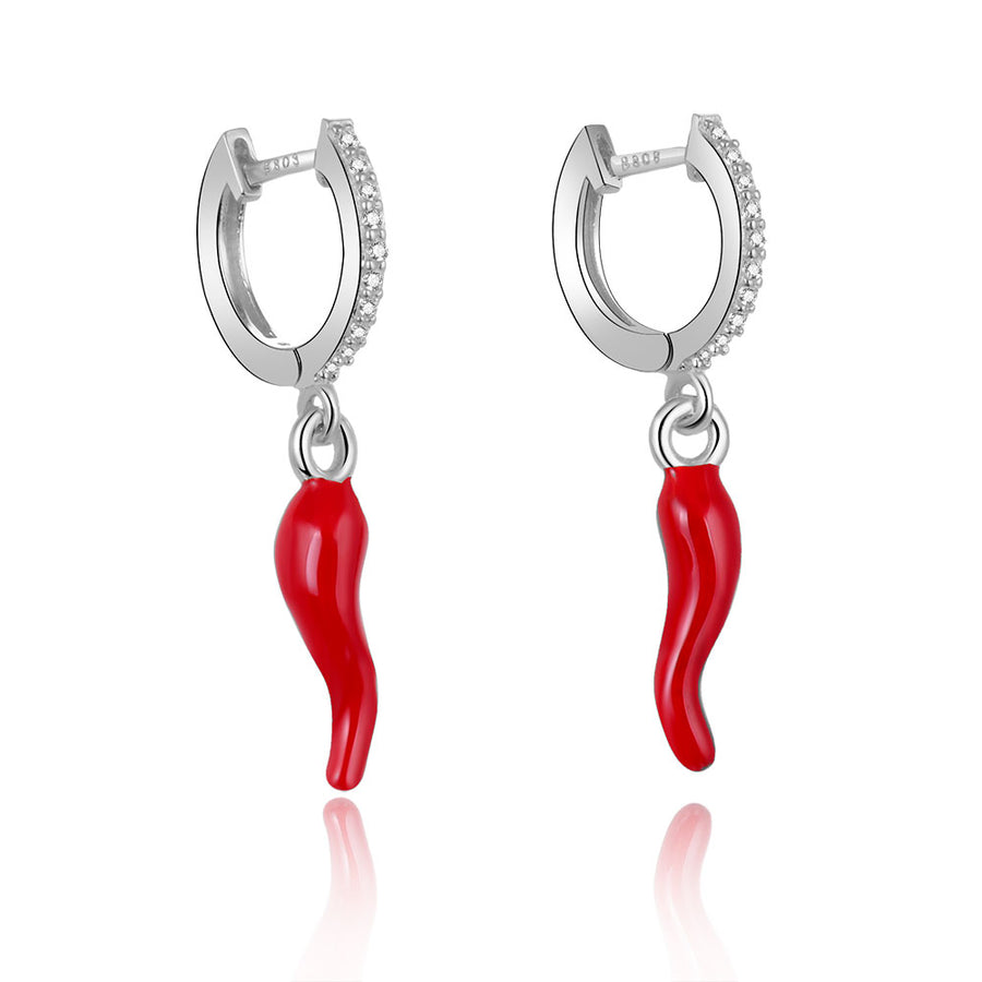A fine gold hoop set with zirconia stones. A red chili pepper hangs from the earring. Many use this as a lucky charm. Ideal earring to make your earrings a little funky.