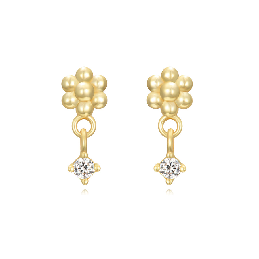 An earstud in the shape of a small flower. At the bottom of the little flower hangs a zirconia stone. The earring measures 14 mm together.