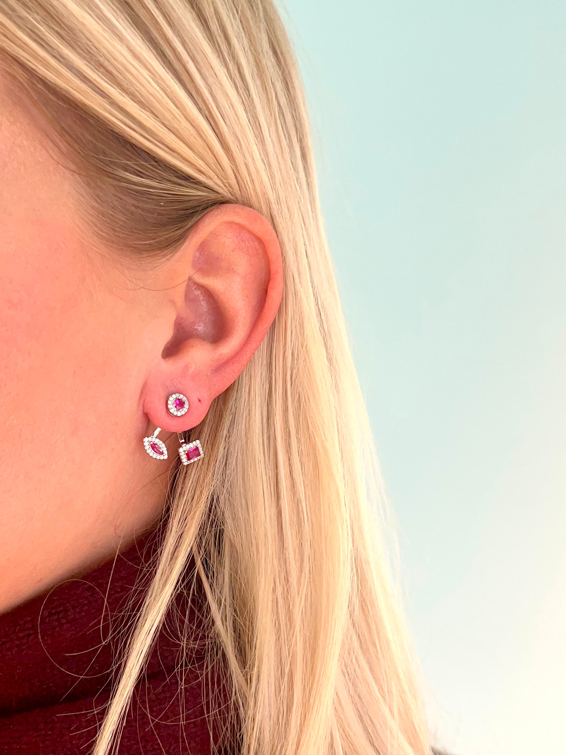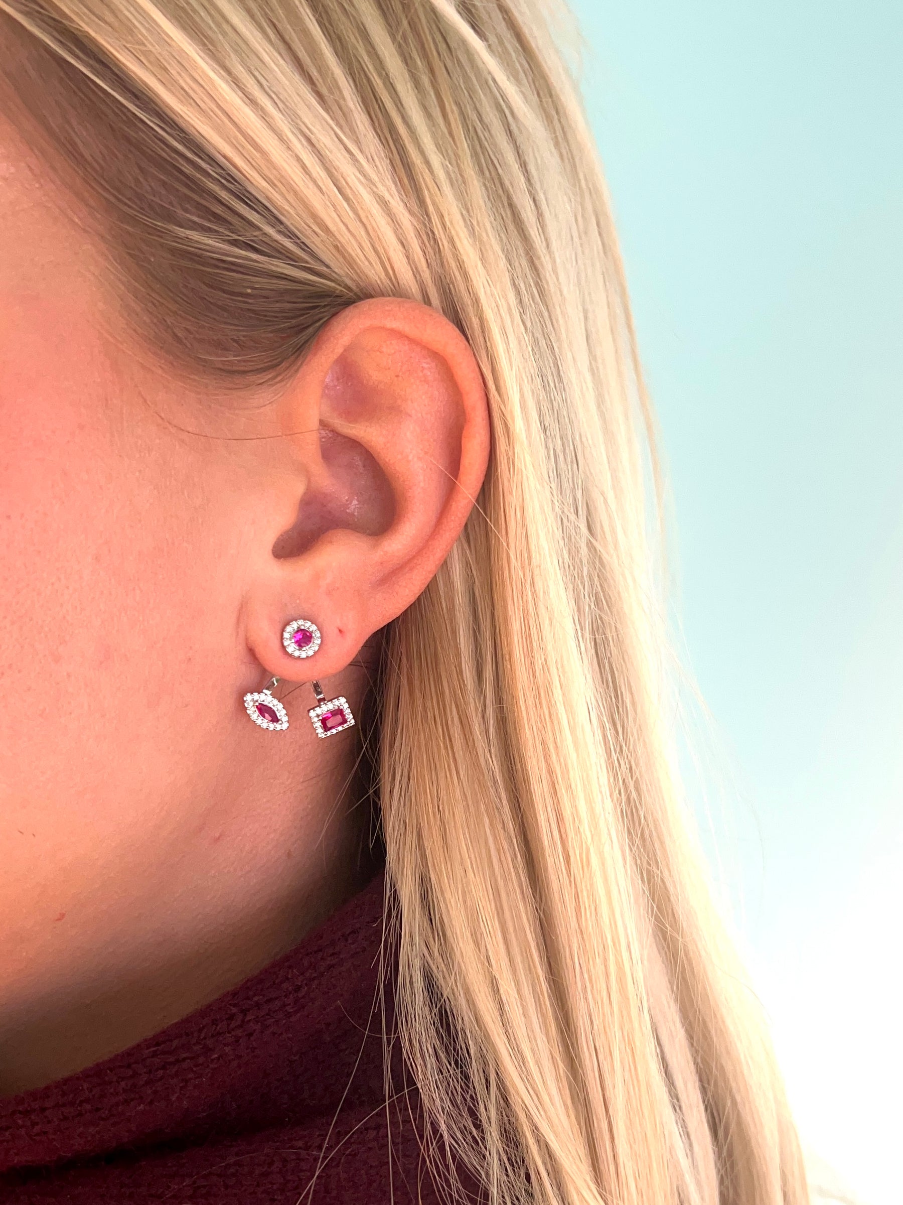 Add a pop of color to your look with these silver-tone pink crystal earrings, designed with a classic front stud and a decorative under-ear bar that attaches behind the lobe. The front piece goes through the piercing like a traditional earring, while the lower element hooks onto the back of the stud, creating a stylish layered effect beneath the ear. Featuring vibrant pink stones framed by sparkling white zirconia, this design offers a modern, elegant twist perfect for everyday wear or special occasions. Sold per piece, these under-ear pink crystal earrings are ideal for anyone who loves unique, eye-catching jewelry with a luxurious finish.