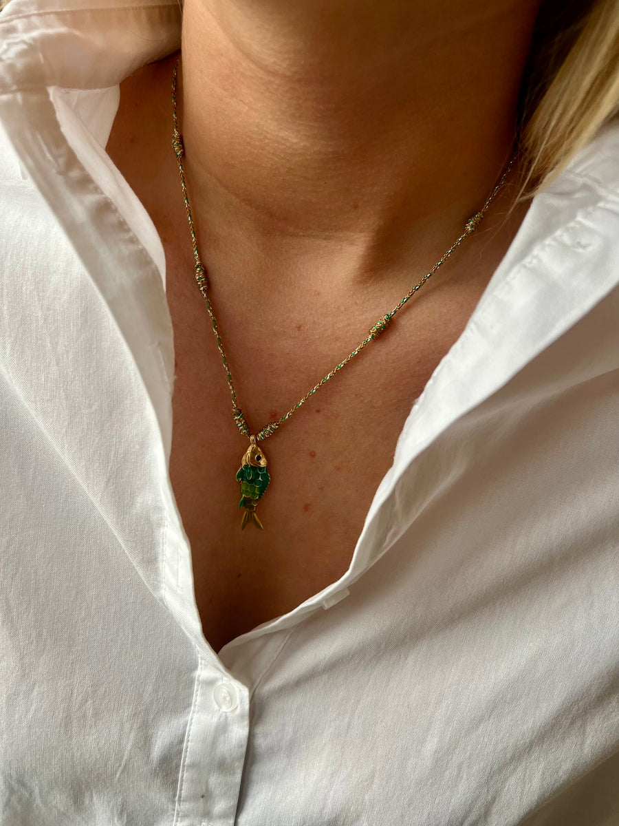 A fish chain on a hanging cord. The string has a yellow-green hue. Adjustable at the back of the necklace.