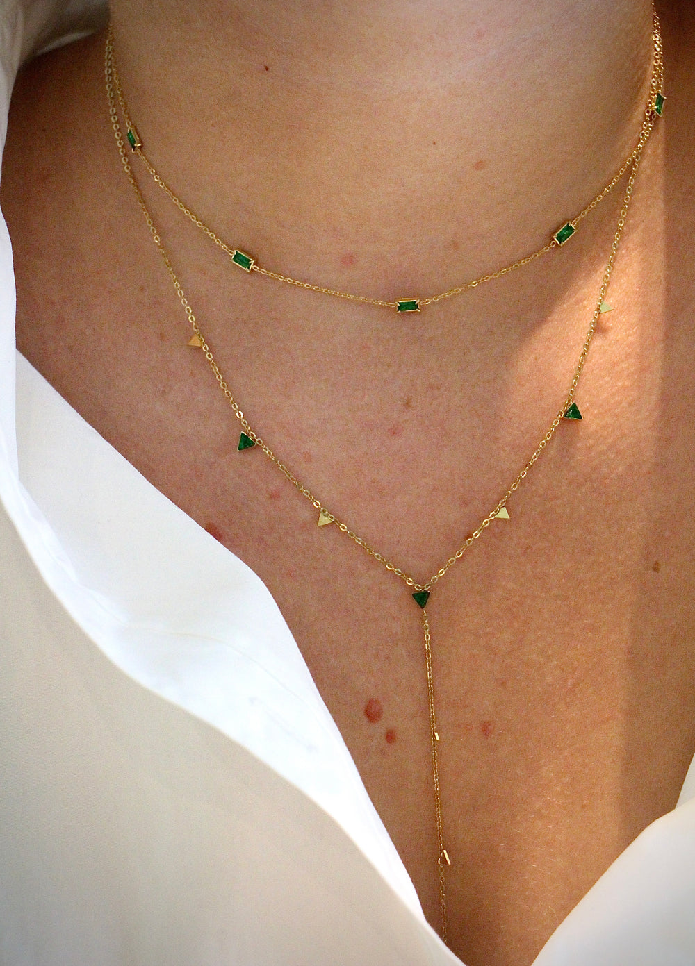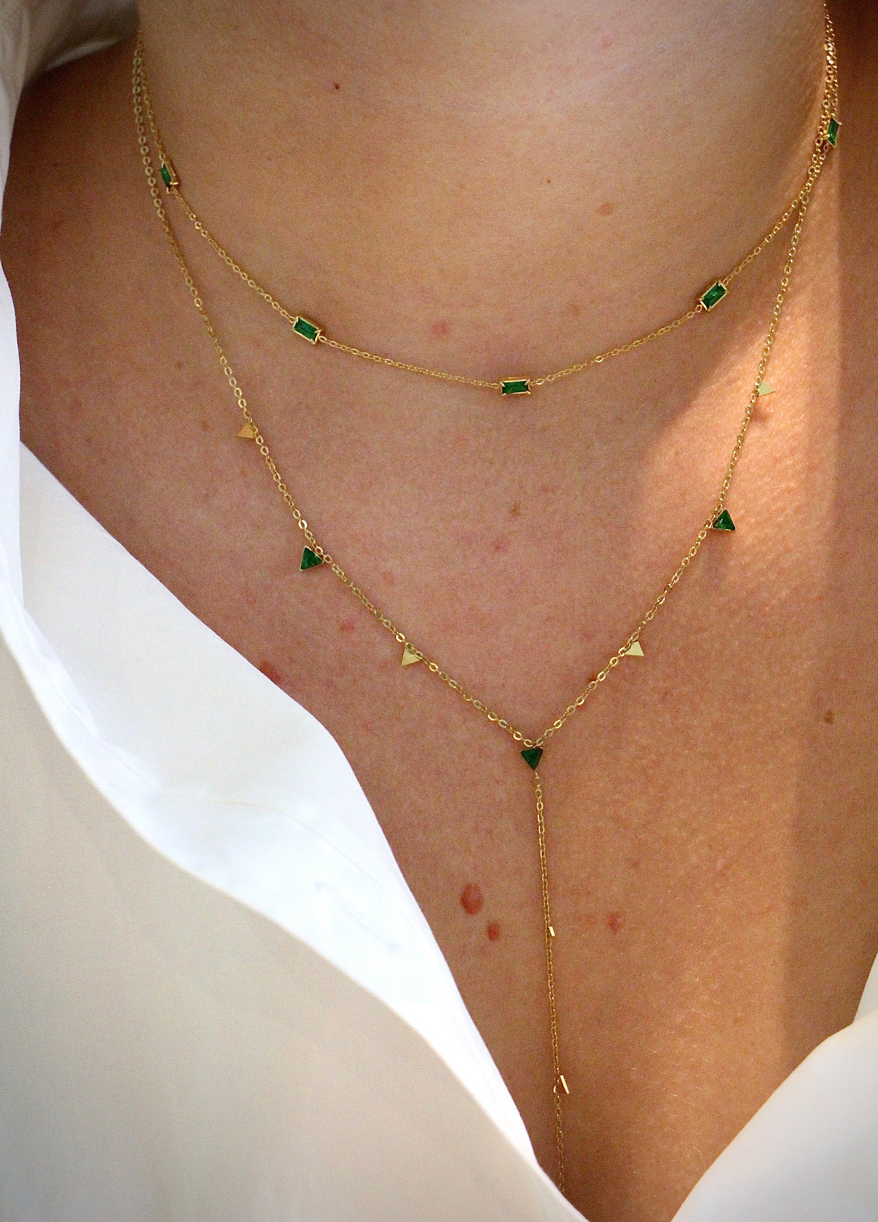 A short necklace with green and gold triangles, fun to combine with the long green triangle necklace.