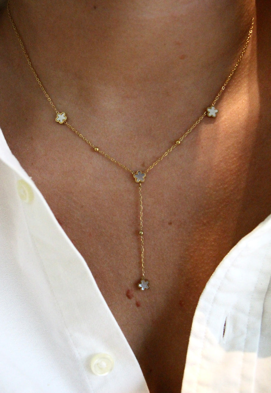 A fine Y shape necklace with our lilou pearl clovers in. Can be worn on its own, or in combination with some other fine necklaces.