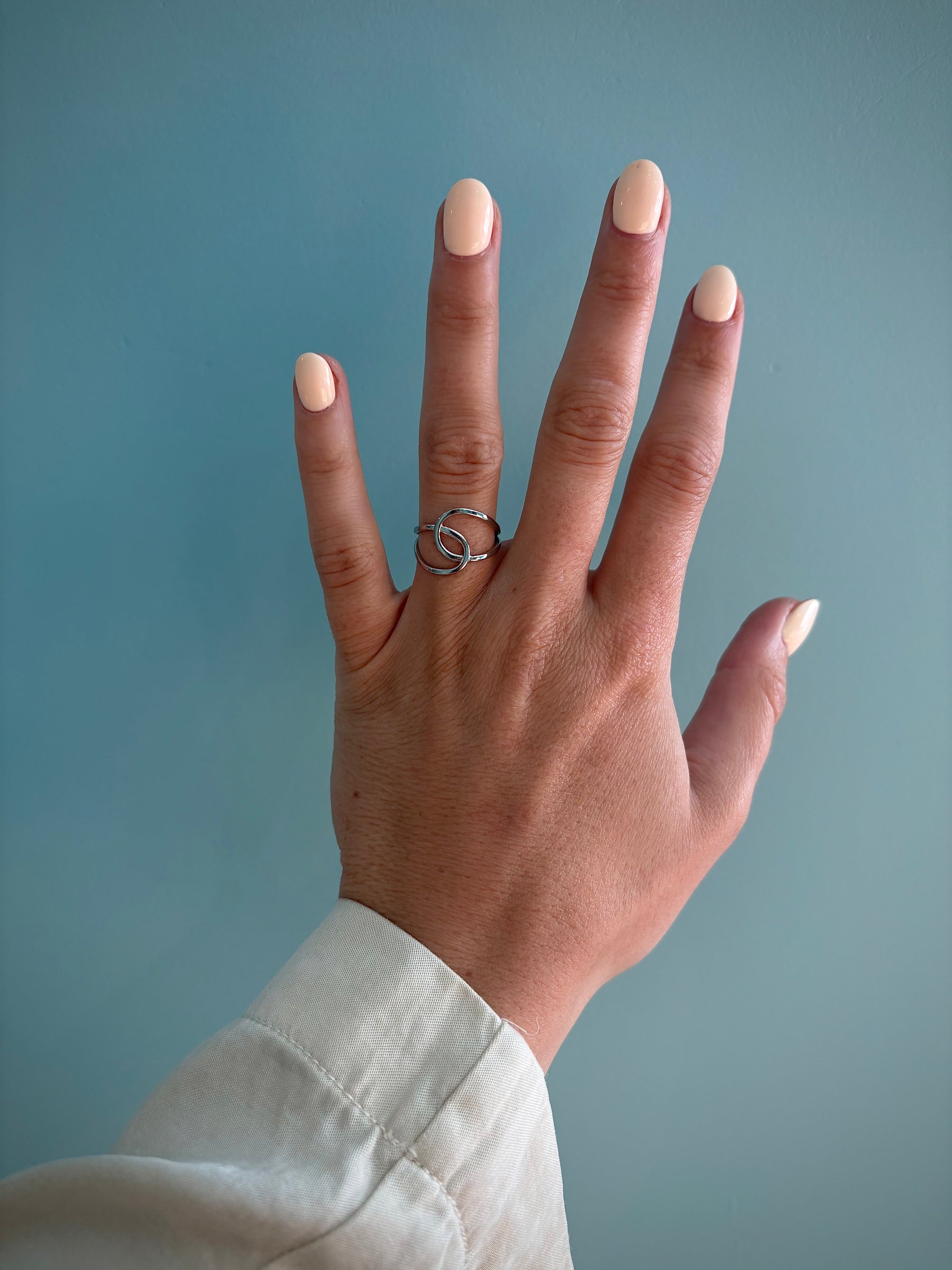 The Crossed Round Silver Ring features a sleek overlapping circular design with smooth polished curves. Its modern crossed silhouette creates a subtle yet contemporary statement.