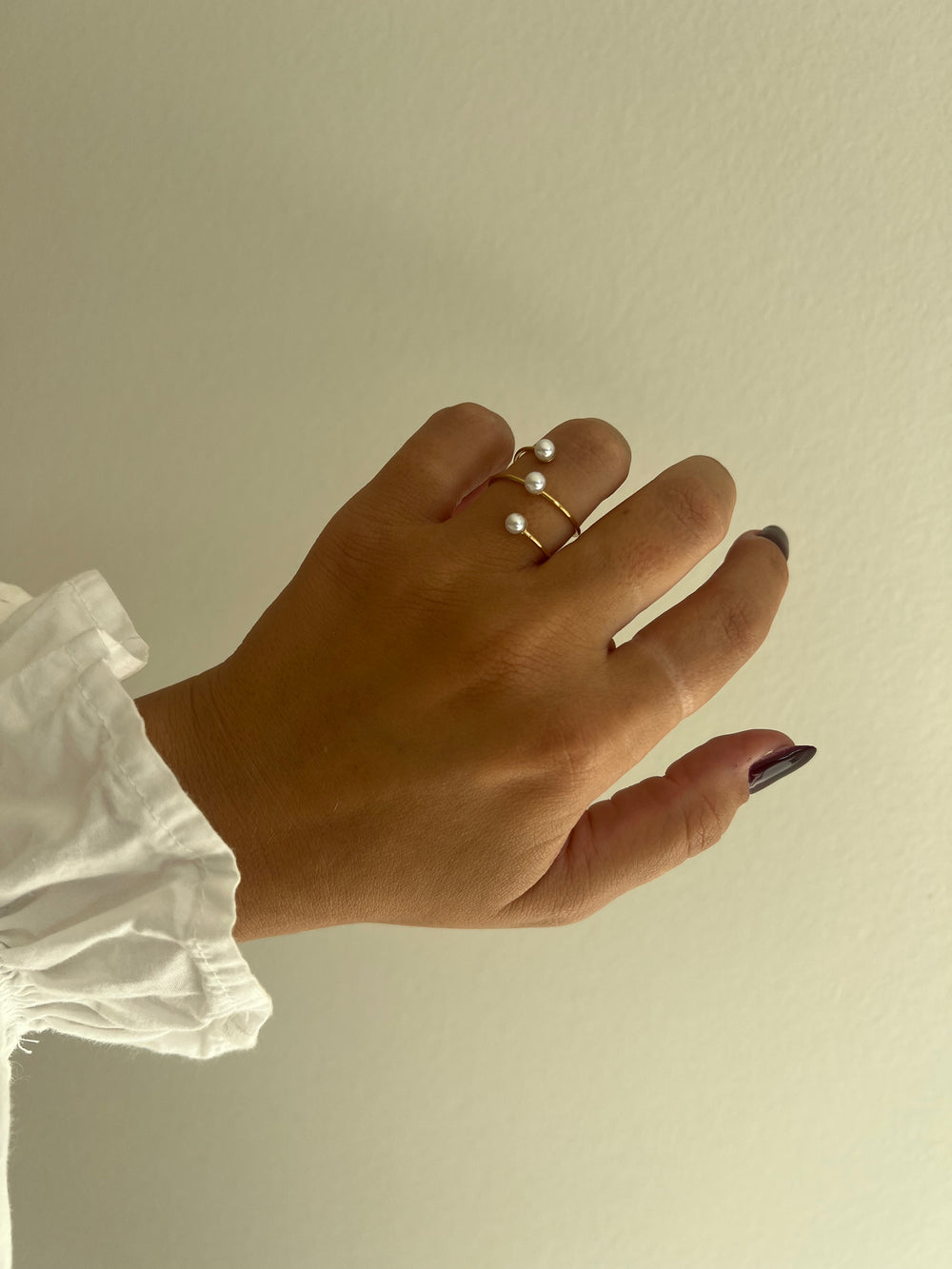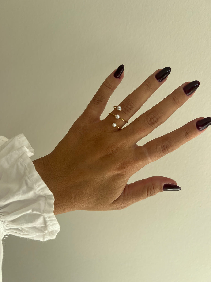 A ring completely twisted around the finger. There are three pearls scattered around the ring. Difficult to adjust, not for narrower fingers.