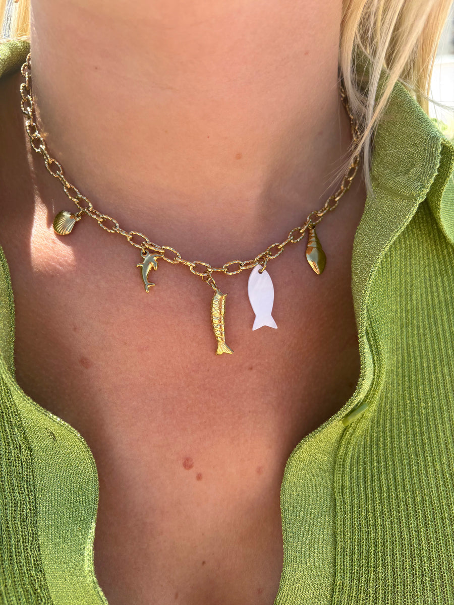 A chain necklace that immediately gives a summer vibe. It has little fish, both white and gold, shells and a small dolphin. It can always be adjusted at the back of the chain.
