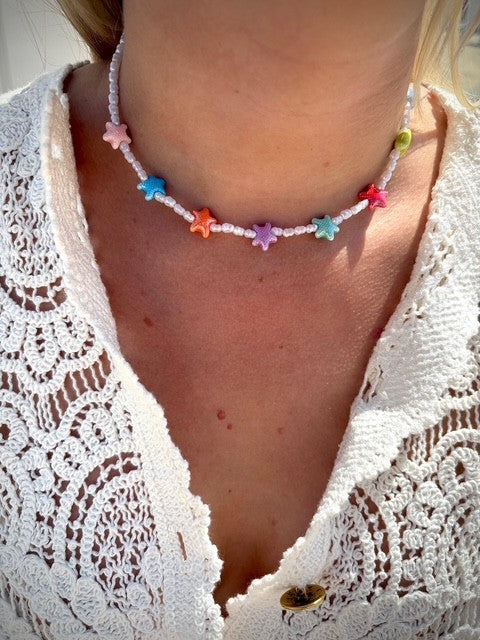 A white pearl necklace with several starfish charms in different colors; very cool on a bikini