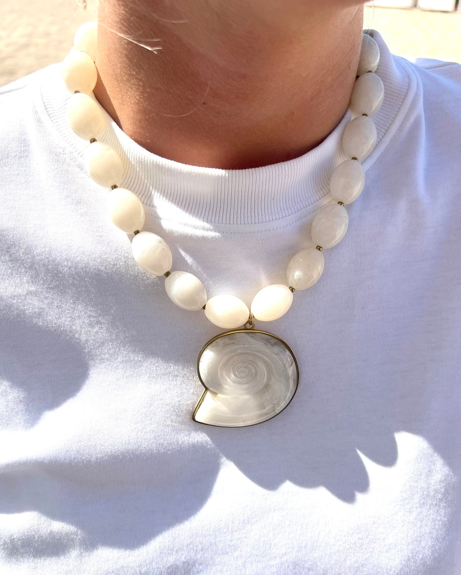 A chunky summer necklace with white peals and big shell in the middle.