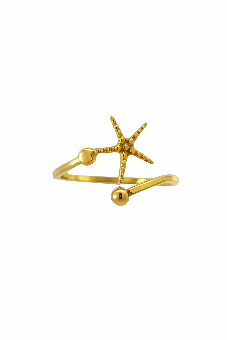 De Starfish Dot Ring is een verstelbare goudkleurige ring, geïnspireerd op de schoonheid van de oceaan. Met een fijn gedetailleerde zeester met subtiele stippen, sluit dit elegante ontwerp sierlijk om je vinger voor een lichte en comfortabele pasvorm. Perfect voor dagelijks gebruik, zomerse outfits of als attent cadeau voor liefhebbers van de zee en het strand.