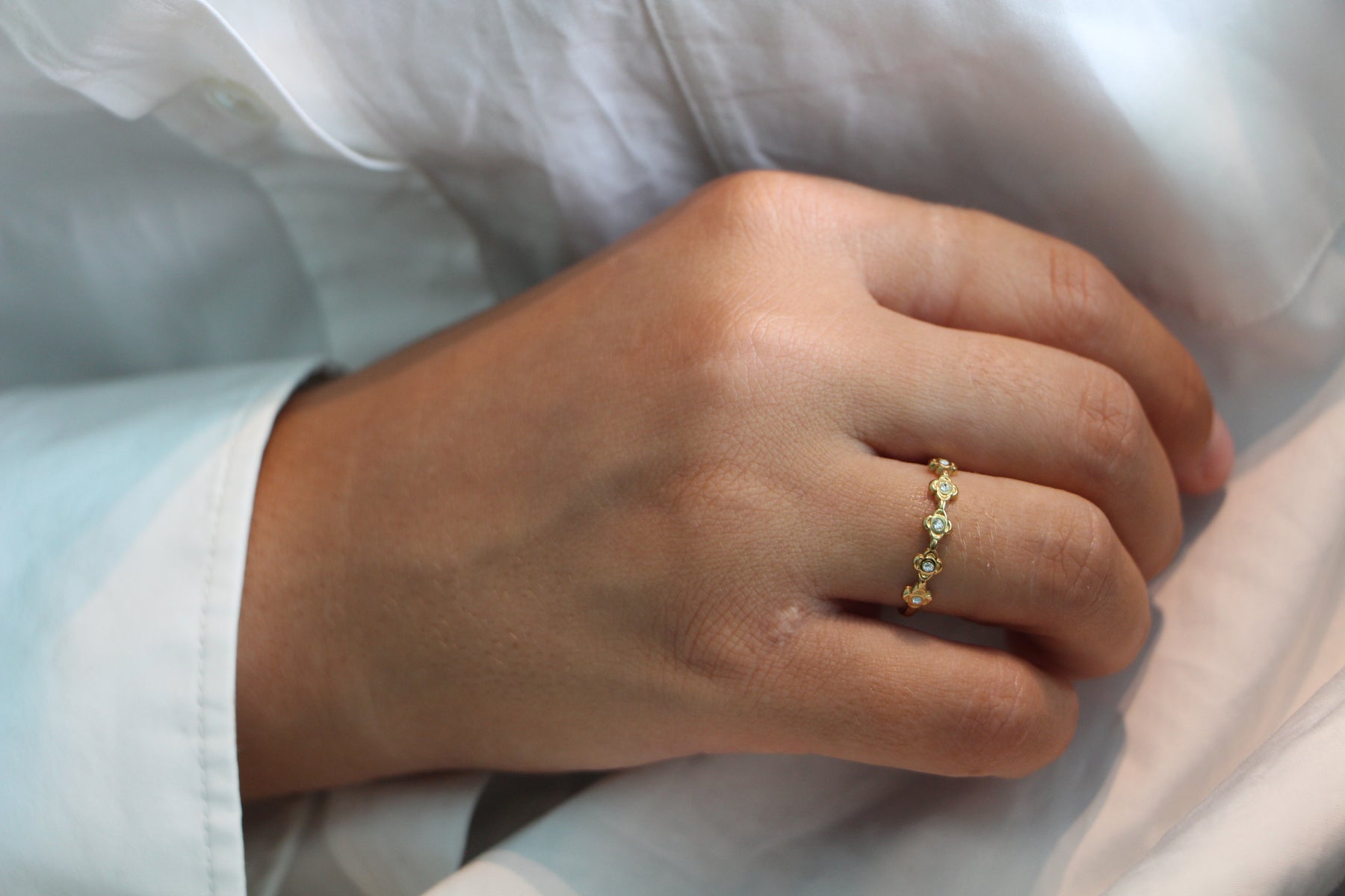 The Meridith Ring features delicate floral details set with subtle sparkling crystals. The fine gold band creates a feminine and refined look.